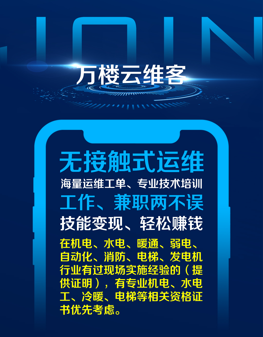维客负责维修万楼云平台签约单位的各种机电设备,包括不仅限于(机电、水电、暖通、弱电、自动化、消防、电梯、发电机等)。而维客只需要通过手机在“万楼云APP”上接单,不受时间和地域限制,充分支配闲置时间。